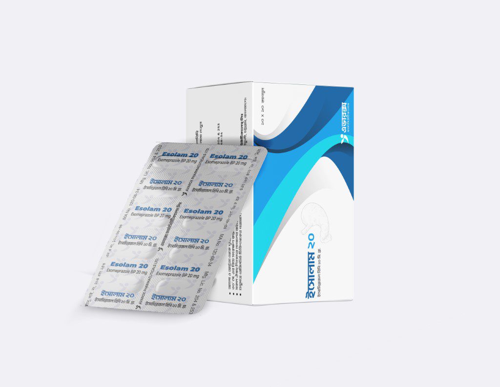 Esolam-20 Capsule: Each capsule contains enteric coated pellets of Esomeprazole Magnesium Trihydrate USP equivalent to Esomeprazole 20 mg.
